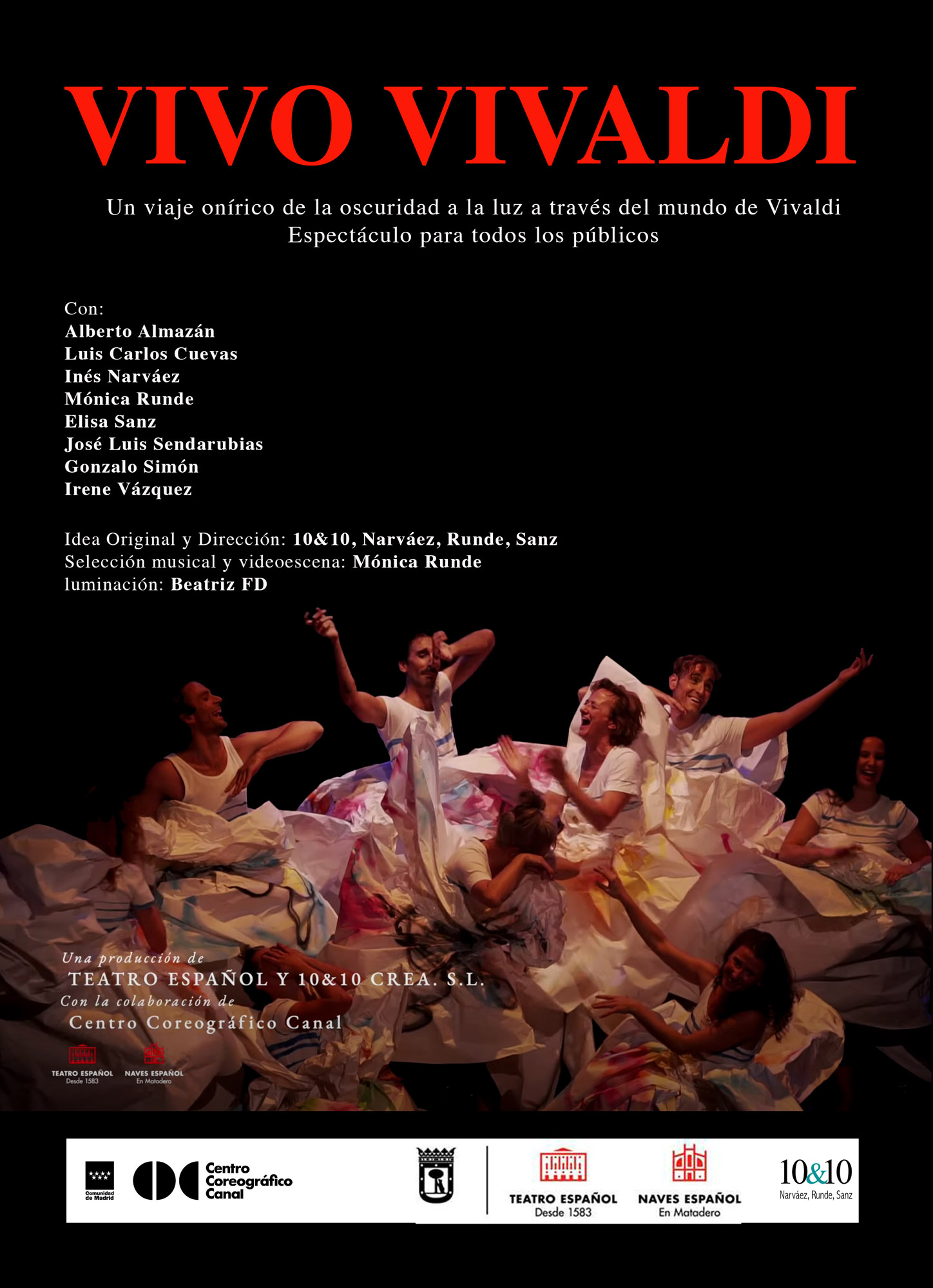 «Vivo Vivaldi es un viaje escénico en el que nos encontramos con 9 personajes que transitan desde la oscuridad a la luz. Desde la fantasía a lo terrenal. Vivo Vivaldi es la resignificacion de lo artificial en naturaleza. Vivo Vivaldi es navegar, es jugar con el monstruo del armario, descubrir el primer amor, ser una bandada de estorninos… Vivo Vivaldi es una tormenta de verano en un palco de la opera de Venecia, es un baile inventado entre polisones y grafitis. Vivo Vivaldi se siente, se vive, se danza, se comparte y se navega desde los tejidos, los cuerpos, la luz, las notas musicales, las emociones. Vivo Vivaldi es jugar, es soñar. Es un trabajo creativo que se compone de muchas capas dramatúrgicas. A las creadoras nos interesa el ritmo escénico propio y particular que se consigue. El trabajo coreográfico bebe de los cuerpos que lo habitan y revisa lugares reconocibles, pero nunca impostados. Es la búsqueda de una forma particular que nos permite escribir el viaje, un viaje que por momentos es real y otros es sueño».